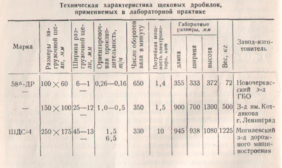 Начальное дробление пробы осуществляется в щековых дробилках. Для первого приема дробления очень удобной является щековая дробилка ЩДС-4 (табл. 1).
