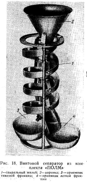 Для выделения тяжелой фракции из проб россыпей удобны винтовые сепараторы. Лабораторная модель винтового сепаратора (из комплекта полевой обогатительной лаборатории ПОЛМ) показана на рис. 18. В воронку загружается навеска, размешанная с водой.