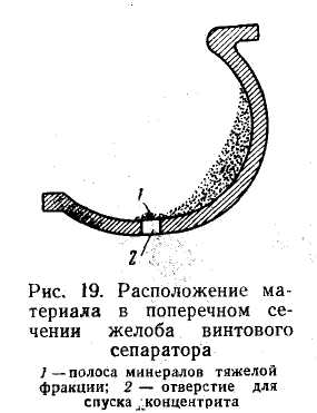 Выделение полосы минералов тяжёлой фракции начинается в конце первого, начале второго витка (у сепаратора «ПОЛМ» — четыре витка). Выгрузка фракции осуществляется через отверстие в дне желоба (на рис. 19 перекрыто резиновой пробкой), а лёгкой - на сливе с желоба.