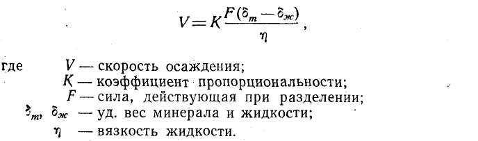 В зависимости от вязкости жидкости, размера и удельного веса зерен разделение происходит с той или иной скоростью. Чем выше скорость оседания (всплывания) частиц в жидкости, тем быстрее происходит разделение. Скорость осаждения зерен в тяжелых жидкостях прямо пропорциональна разности между удельным весом зерна и жидкости, силе, под действием которой происходит осаждение, и обратно пропорциональна вязкости жидкости: