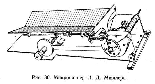 Для выделения мономинеральных фракций из навесок малого веса Л. Д. Мюллером был предложен микропаннер, представляющий собою модификацию концентрированного стола, у которого дека свободна от нарифлений и имеет V-образное сечение (рис. 30). Дека закреплена хомутиками на вале, вдоль которого она вибрирует от специального приводного устройства.