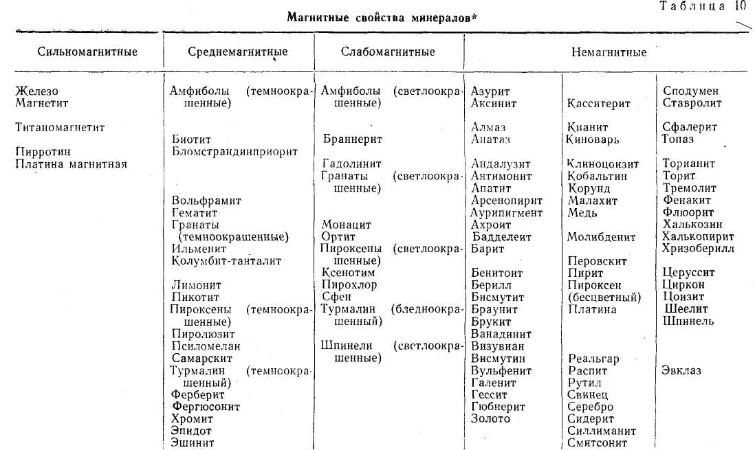 В минералогии все минералы по их магнитным свойствам принято делить на четыре группы: сильномагнитные, притягивающиеся обычным постоянным магнитом; среднемагнитные, отделяющиеся электромагнитом при небольшой силе тока; слабомагнитные, отделяющиеся электромагнитом при большой силе тока, и немагнитные (табл. 10).