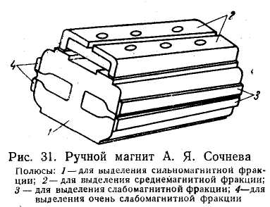 Универсальный магнит А. Я. Сочнева марки С-5 (рис. 31) имеет четыре рабочих зоны (полюса) и позволяет выделять четыре магнитные фракции: сильномагнитную (магнетитовую), среднемагнитную (ильменитовую), слабомагнитную (гранат-вольфрамитовую) и очень слабомагнитную (монацитовую).