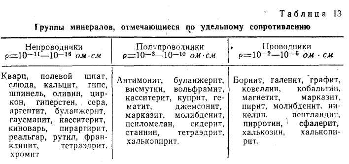 Эти методы сепарации минералов основаны на различии электропроводности минералов. Минералы по способности проводить электрический ток условно делятся на три группы: непроводники, полупроводники и проводники (табл. 13). Величины удельного сопротивления даже у одного и того же минерала могут значительно колебаться в зависимости от примесей (железо, марганец и др.).