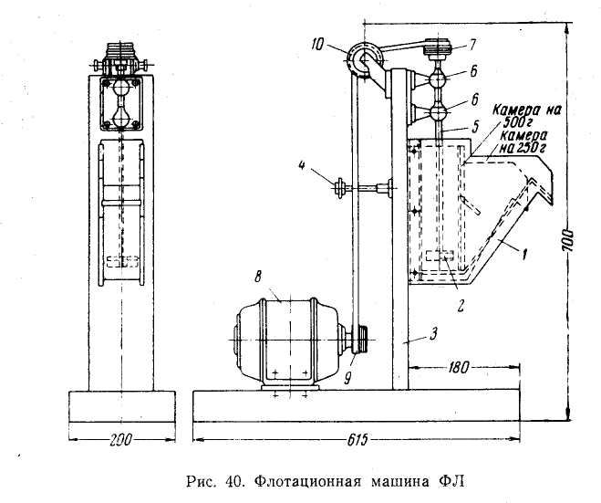 Вращение мешалки в камере осуществляется ременным приводом от мотора 8 через ступенчатые шкивы 7 и 9 и блоки 10. Направление вращения подбирается с таким расчетом, чтобы обеспечить циркуляцию пульпы по часовой стрелке. При этом пульпа из отстойной камеры, опускаясь вниз, проходит через нижнюю щель, насыщается воздухом в агитационном отделении и выбрасывается в отстойное отделение через верхнюю щель под козырьком. Воздушные пузырьки образуют слой пены, который по мере образования снимается скребком. Козырек служит для предохранения пены от разрушения струей пульпы.
