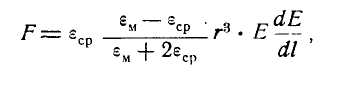 Принцип разделения минералов по диэлектрической проницаемости заключается в следующем. В сосуд наливают жидкость с диэлектрической проницаемостью ( ε ), равной средней величине проницаемости разделяемых минералов. Затем в этот сосуд засыпают смесь минералов и вставляют электроды, вмонтированные в эбонитовый патрон. Концы электродов присоединены к вторичной обмотке трансформатора с переменным напряжением. При прохождении тока минералы с высшей диэлектрической проницаемостью отталкиваются к электродам, а минералы с низшей диэлектрической проницаемостью отталкиваются от них. Возникающая сила притяжения или отталкивания равна: