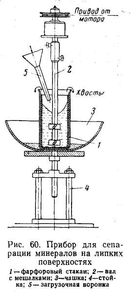 Г. А. Коц и Е. В. Рожкова предложили метод центробежной сепарации минералов на липких поверхностях, который в ряде случаев обеспечивает высокую избирательность разделения для мелких и даже мельчайших фракций. Этот метод основан на различиях в смачиваемости минералов водой. Извлечение обус- ловливается избирательным закреплением зерен на неподвижной липкой поверхности. Соприкосновение зерен минералов с липкой поверхностью осуществляется под действием центробежных сил, величина которых значительно превышает силы тяжести обрабатываемого зерна. Процесс сепарации зависит от состава мази, температуры воды и скорости вращения импеллера, а также от ряда используемых при флотации приемов: применение реагентов-чсобирателей, депрессоров, регуляторов и др. Простейший прибор для сепарации на липких поверхностях (рис. 60) состоит из фарфорового стакана емкостью 100 см3, внутренняя поверхность которого покрыта липкой мазью. В стакане с помощью укрепленного на штативе мотора вращается вал с импеллером. Мазь наносится на дно и стенки стакана в расплавленном состоянии медленным вращением последнего в наклонном положении с последующим сливанием избытка мази в другой сосуд. Стакан заполняется водой и устанавливается в чашке с плоским дном.