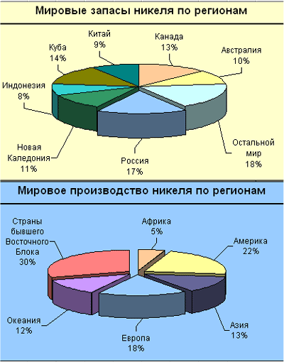 По региональному признаку, производство никеля сосредоточено в странах, обладающий наибольшими запасами металла. Так крупнейший производитель металла в мире – Россия, чей совокупный процент в общемировом производстве достигает 20.4% (на 2000 год).
