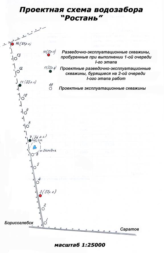- задача хозпитьевого водоснабжения г. Борисоглебска с потребностью 52000 м3 /сут может быть решена в соответствии с планом за счет использования ресурсов месторождения «Ростань» (44000 м3 /сут). Оставшиеся потребности могут быть удовлетворены водами неогеновых и четвертичных водоносных комплексов городского водозабора «Чигорак».
