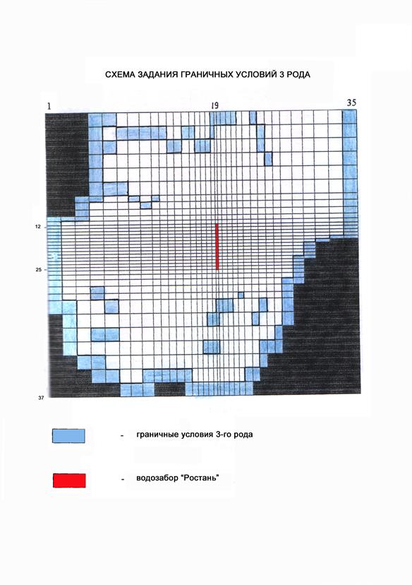 и обусловлены необходимостью реализации в модели проектных эксплуатационных скважин. Максимальные размеры блоков - к краевым частям модели (в связи с этим здесь отмечаются отклонения модельного и фактического положения русел моделируемых поверхностных водотоков). Всего было задано 37 блоков по оси J (строки) и