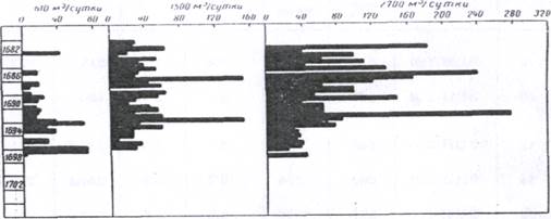Несоответствие этих объяснений реальным условиям и противоречивость их можно показать на примере нефтепроявлений при бурении скв.402 Мухановского месторождения. Обычно в промысловой документации нефтегазопроявления отмечаются лишь как факты. В скв.402 процесс нефтепроявления изучался специально. Ее бурили с промывкой глинистым раствором удельного веса 1,27 - 1,29 Г/см3 . При глубине забоя 2542 м бурение было приостановлено для проведения каротажа. Скважина простаивала 36 ч. Продуктивные нефтеносные пласты нижнего карбона залегают на глубине 2150-2250 м . Давление от столба раствора на уровне пластов было на 35-45 ат выше пластового. После каротажа бурение и промывка были возобновлены.
