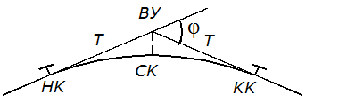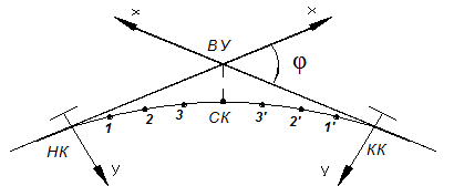 Используя полученные значения, определяем положения главных точек круговой кривой (НК; СК; КК) и вычисляем их пикетажное значение. Только после этого производится дальнейшая разбивка трассы.