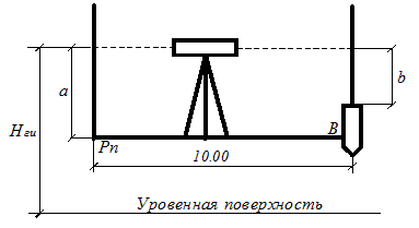 Задача решается на ровном участке местности. Преподаватель задает положение репера, его высота равна 120,50 м. На расстоянии 10 м от репера требуется построить точку В, высота которой равна 120,77 м (рис. 16). В точке В, где должна быть построена высота, забивается деревянный колышек, верхняя часть которого устанавливается заведомо выше предполагаемого положения точки В.