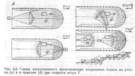 Наряду с орошением осуществляется местное искусственное проветривание участков, прилегающих к взорванному блоку, что позволяет помимо пыли снизить концентрацию вредных газов, скопившихся в застойных зонах.