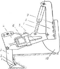 Рис. 1 - Конструктивная схема навесного рыхлителя: 1 - наконечник зуба: 2 - стопорное устройство; 3 - стойка: 4 - поворотная скоба; 5 - тяга; 6 - рабочая рама: 7 - гидроцилиндр привода; -V- опорный кронштейн: 9 - болты крепления на базовом тракторе: 10 – тягач