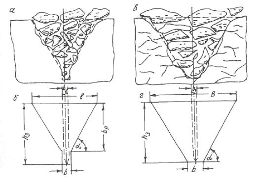 Рис. 3 - Сечения одиночных борозд рыхления: а, б - соответственно фактическое и теоретическое для монолитного массива; в, г – соответственно фактическое и теоретическое для трещиноватого массива.