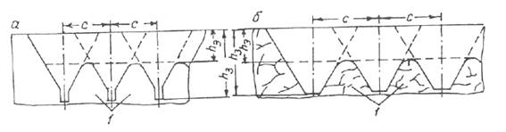 Рыхление массива производится параллельными смежными проходами рыхлителя. Расстояние между двумя смежными проходами Сс.п выбирается из условия обеспечения требуемой кусковатости и глубины рыхления массива. При параллельных проходах рыхлителя между двумя смежными бороздами в нижней части последних образуются целики, которые затрудняют выемку породы на полную глубину внедрения (см. рис. 4). Поэтому глубина эффективного рыхления массива h э меньше заглубления зуба h з . Разрушение целиков может производиться перекрестными проходами рыхлителя, перпендикулярными (диагональными) к первоначальным (параллельным смежным) проходам.