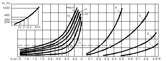 Рис. 5 - Номограмма для определения возможного заглубления h з зуба рыхлителя в зависимости от акустических характеристик массива υу и R , мощности тягача N и силы тяги F рыхлителя: 1,2,3,4 - при значениях υу соответственно 1000, 2000, 3000 и 4000 м/с