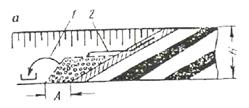 При рыхлении монолитного массива в нижней его части образуется щель (рис. 4), ширина которой соответствует ширине применяемого наконечника, а глубина составляет 15-20 % от заглубления зуба. Угол наклона боковых стенок борозды α изменяется в зависимости от состояния рыхлимого массива в пределах 30 - 80°. При рыхлении сложнотрещиноватого массива (см. рис. 4) разрушение происходит по плоскостям ослабления его трещинами. Внедрение зуба в массив при этом сопровождается интенсивным разрушением стенок по всей глубине борозды.