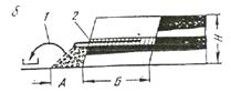 Механическое рыхление пород осуществляется при движении тягача с заглубленным зубом. При создании значительных усилий на режущей кромке зуба происходит отрыв кусков породы от массива и разрушение породы в пределах трапециевидной прорези (рис. 3). Разрушение породы происходит в результате развития в ней сложного напряженного состояния. В разных частях прорези разрушение идет разными путями. Порода разрушается преимущественно путем сжатия и сдвига перед лобовой гранью зуба, отрыва и сдвига - в боковых расширениях прорези и среза - у боковых ребер зуба возле режущей кромки. Кроме того, затупленной режущей кромкой или изношенным наконечником осуществляется смятие породы.