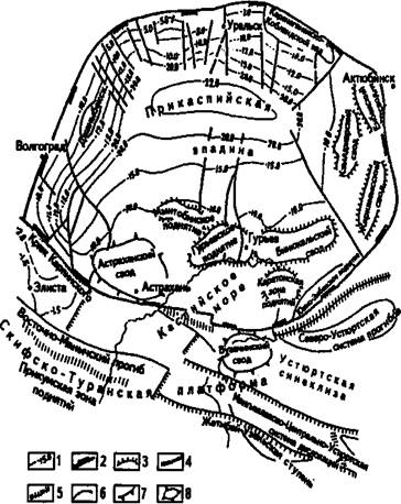1 - изогипсы поверхности докембрийского фундамента; 2 - граница крупнейших структурных элементов; 3 - выступы, валы, тектонические ступени, зоны поднятий; 4 -разломы, разделяющие надпорядковые и крупнейшие тектонические элементы; 5 -тектонические ступени, крупные грабены; 6 - разрывные нарушения; 7 - флексуры; 8 -крупные тектонические элементы