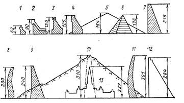 Рис.1. Поперечні профілі сучасних гребель у порівнянні з силуетами інших споруд (розміри в метрах):