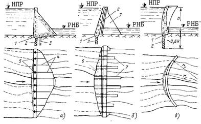 а) гравітаційні; б) контрфорсні; в) аркові; 1 – зуб; 2 – цементаційна завіса; 3 – дренаж; 4 – температурні шви; 5 – ущільнення швів; 6 – плита перекриття; 7 – контрфорс