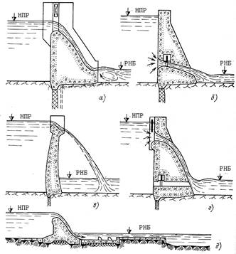 а – поверхневий отвір з затвором; б – глибинний; в – поверхневий отвір з трампліном; г – глибинний і донний; д – поверхневий з гасителями в нижньому б'єфі