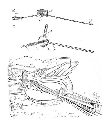 а – поздовжній розріз; б – план; в – загальний вид; 1 – верхній судновізний шлях; 2 –поворотний круг; 3 – камера; 4 – нижній судновізний шлях; 5 – тупиковий роз’їзд з монтажним майданчиком