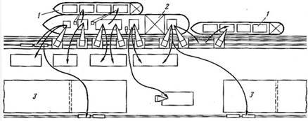 Рис.1.3. Обробка вантажу в порту за схемами: судно – судно; судно – вагон; судно – склад; 1 – морський теплохід; 2 – річковий теплохід; 3 - склад