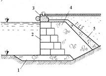 1 - гребля; 2- поверхня фільтруючої води; 3 – кріплення укосу