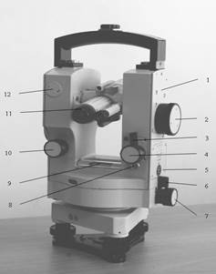 Рис. 1. Теодолит 4Т30 при положении круг лево (КЛ): 1- крышка боковая; 2- рукоятка микрометра; 3, 6- винты закрепительные куркового типа; 4, 7- винты наводящие; 5- крышка; 8- винт уровня юстировочный; 9- уровень при алидаде горизонтального круга; 10-винт уровня установочный при алидаде вертикального круга; 11- колпачок; 12- пробка.