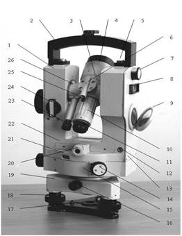 Рис. 2. Теодолит 4Т30 при положении круг право (КП): 1- колонка; 2- ручка; 3- кольцо клиновое; 4- труба зрительная; 5- винт; 6- визир коллиматорный; 7- призма-лупа поворотная; 8- окно; 9- зеркало; 10- кремальера; 11- окуляр зрительной трубы; 12- гнездо штекерное; 13- крышка боковая; 14- рукоятка; 15- корпус низка; 16- винт подставки закрепительный; 17- пружина трегера; 18- винт подъемный; 19- подставка; 20- окуляр оптического центрира; 21- иллюминатор круга-искателя; 22- крышка; 23- окуляр микроскопа; 24- рукоятка переключателя; 25- флажок отражателя; 26- ось горизонтальная