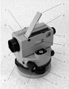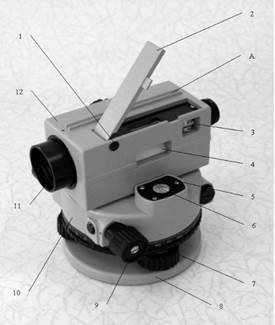 Рис. 6. Общий вид нивелира 3Н-5Л: 1- заглушка; 2- зеркало; 3- юстировочные гайки цилиндрического уровня; 4- белый экран; 5- юстировочные винты круглого уровня; 6- круглый уровень; 7- подъемный винт; 8- подставка; 9- наводящий винт; 10- корпус низка; 11- объектив; 12- корпус; А- продольный прилив (механический визир)
