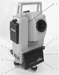Рис. 18. Тахеометр 3Та5: 1- карта памяти; 2- закрепительный винт; 3- клеммы; 4- узел сопряжения с картой памяти; 5- окуляр оптического центрира; 6- юстировочный винт; 7- кнопка инжектора