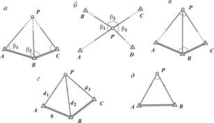 Для определения планового положения точки необходимо измерить два элемента. Для контроля, кроме необходимых, выполняют избыточные измерения. Засечки различают прямые, обратные и комбинированные. В прямой засечке измерения выполняют на исходных пунктах (рис. 6.6 a , г ); в обратной – на определяемом пункте (рис. 6.6 б , д ); в комбинированной – на исходных и определяемом пунктах (рис. 6.6 в ). В зависимости от вида измерений засечки бывают угловые (рис. 6.6 a , б , в ), линейные (рис. 6.6 г ), линейно-угловые (рис. 6.6 д ). Измеренные углы на рис. 6.6 отмечены дугами, измеренные расстояния – двумя штрихами.