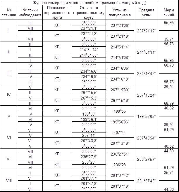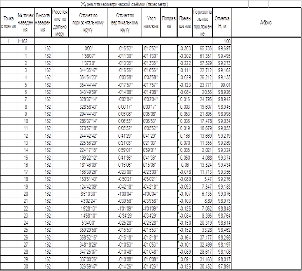 Результаты измерений записывают в журнал тахеометрической съемки.
