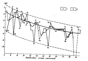 Рис. 1. Логарифмы кларков химических элементов: 1-четных; 2-нечетных.