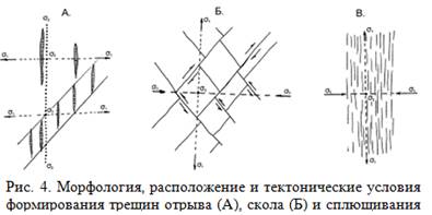 Оси σ2 иσ3 залегают в плоскости трещины отрыва: в общем (простейшем) случае ось σ3 залегает в направлении простирания формирующейся трещины отрыва, а ось σ2 – совпадает с линией её падения (рис. 4). Трещины скола – по морфологии прямолинейны или слабоизвилисты и характеризуются притертыми (тесно сжатыми) краями и наличием на плоскостях трещин штрихов (борозд) скольжения. Последние свидетельствуют о перемещении стенок трещин относительно друг друга. Трещины обычно «пустые» (без выполнения) и лишь в местах изгибов при перемещении стенок трещин могут возникнуть пустые (позднее выполненные жильными минералами) небольшие по мощности полости.