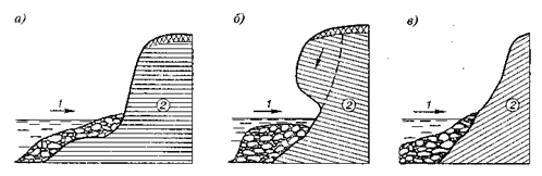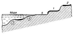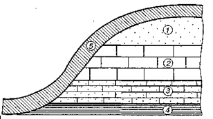 Рис. 19 Суффозионная полость (1) в лессовых породах, залегающих на склоне рельефа, сложенном известняками-ракушечниками (2); 3 – здания.