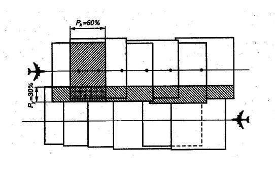 Чаще всего снимаемый участок не может быть размещен на одном снимке, тогда участок фотографируется последовательно маршрут за маршрутом. Съемочные маршруты летательного аппарата прокладываются прямолинейно, обычно с запада на восток и в обратном направлении, на постоянной высоте. При этом соблюдается перекрытие вдоль маршрута между снимками до 57-60% от рамки кадра и поперечное перекрытие между маршрутами – 20-40% от рамки кадра. Время съемки выбирается так, чтобы солнце не было скрыто облаками и стояло над горизонтом не слишком низко и не в зените (рис.1).