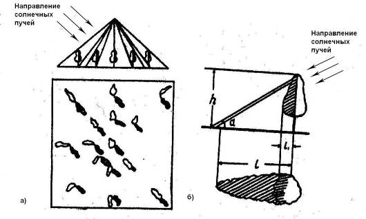 а – отклонение изображений высоких объектов. Тени объектов заштрихованы; б – определение высоты дерева h по длине его падающей тени l .