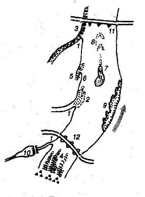 При дешифрировании природных, экономических и других объектов широко применяют косвенные признаки. Так, например, грунтовая дорога подходит к реке и продолжается на другом ее берегу, очевидно, что через реку есть переправа. А если берега пологие, сильно разъезженные у воды, и на реке заметен перекат, то здесь возможен и брод. По рисунку проселочной дороги можно судить о грунтах местности: на влажных участках дорога сильно разбита, имеет много объездов; на песчаном грунте – границы дороги расплывчатые ; на глинистом грунте контур дороги резко выражен, как бы врезан. Направление течения реки можно определить по притокам, впадающим под острым углом к направлению течения; выносы притоков сносятся по течению реки; острова сужаются вниз по течению (рис. 3).
