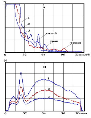 1 – урановый спектр (уран – линия урана 1762 КэВ), 2 – ториевый спектр (торий – линия тория 2620 КэВ), 3 – калиевый спектр (калий – линия калия 1460 КэВ). B – «мягкая» часть спектров (первые 128 каналов 1024 канальных спектров).