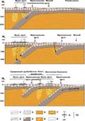 В плиоцене, в результате причленения полуостровов, а, вероятно, и некоторых других структур Восточной Камчатки, зона субдукции Тихоокеанской плиты на участке между Шипунским п-овом и сочленением с Алеутской дугой оказалась заблокированной. Вследствие этого произошел перескок зоны субдукции на современное положение и Курило-Камчатская островодужная система сформировалась в современном виде. Концептуальная модель развития сегмента Курило-Камчатской островодужной системы между ее сочленением с Алеутской островной дугой и Малко-Петропавловской зоной поперечных дислокаций показана на рис. 8.