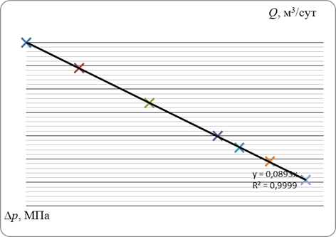 Для того чтобы определить, по какому закону происходит фильтрация нефти в начальный момент времени, необходимо по данным исследования скважины построить индикаторную диаграмму. При этом наносятся точки, и подбирается теоретическая индикаторная диаграмма (рисунок 2).