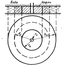 Рассмотрим задачу о вытеснении нефти водой в условиях плоскорадиального движения по закону Дарси в пласте, изображённом на рисунке 3. На контуре питания радиуса RК поддерживается постоянное давление рк, на забое скважины радиуса rс – постоянное давление рс, толщина пласта h и его проницаемость k также постоянны. Обозначим через R0 и rн соответственно начальное и текущее положение контура нефтеносности, концентричные скважине и контуру питания, через рв и рн – давление в любой точке водоносной и нефтеносной области соответственно, через р – давление на границе раздела жидкостей.