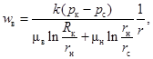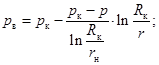 В случае установившегося плоскорадиального движения однородной жидкости и если изобару, совпадающую в данный момент с контуром нефтеносности, принять за скважину, то распределение давления и скорость фильтрации в водоносной области можно выразить так: