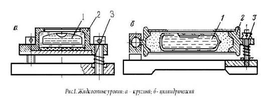 Основными элементами жидкостного уровня являются его чувствительный элемент (ампула с жидкостью) и оправа для крепления. Жидкостные уровни бывают круглые и цилиндрические. В круглом уровне (рис. 1, а) в качестве ампулы используется стеклянный сосуд 1, верхняя часть которого отшлифована по сферической поверхности. Сосуд заполнен легкоподвижной жидкостью и содержит свободное пространство (пузырек уровня). В цилиндрическом уровне (рис.1, б) ампула представляет собой стеклянную трубку 1, внутренняя поверхность которой отшлифована в виде бочкообразного тела вращения и заполнена жидкостью.
