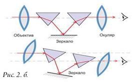 При работе с нивелиром, так же как и с другими оптическими приборами, изображение объекта передается на сетчатку глаза человека через оптическую систему прибора. Пройдя через объектив, луч попадает на приемную призму. Затем луч преломляется приемной призмой и попадает на горизонтально расположенное зеркало. Отражаясь от зеркала, луч попадает на передающую призму, а затем на окуляр (рис. 2. б).